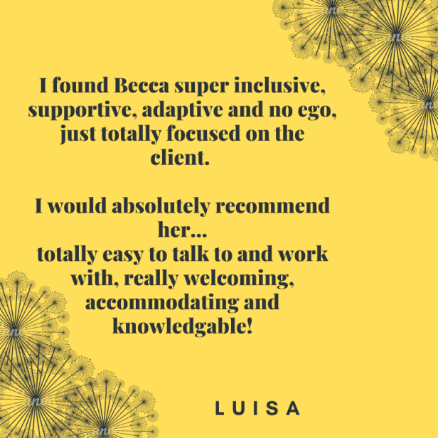 I found Becca’s coaching style really super inclusive, supportive, adaptive and no ego, just totally focused on the client.