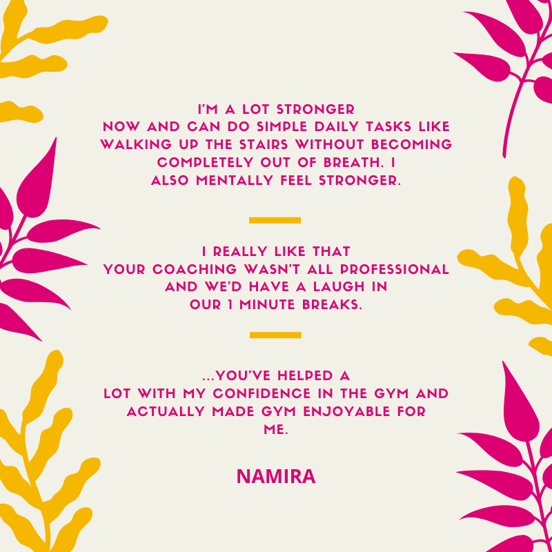 Huge thanks to my client Mehdiya for her kind words in this awesome testimonial. I have really enjoyed working with her and am so looking forward to being part of her ongoing journey into strength.