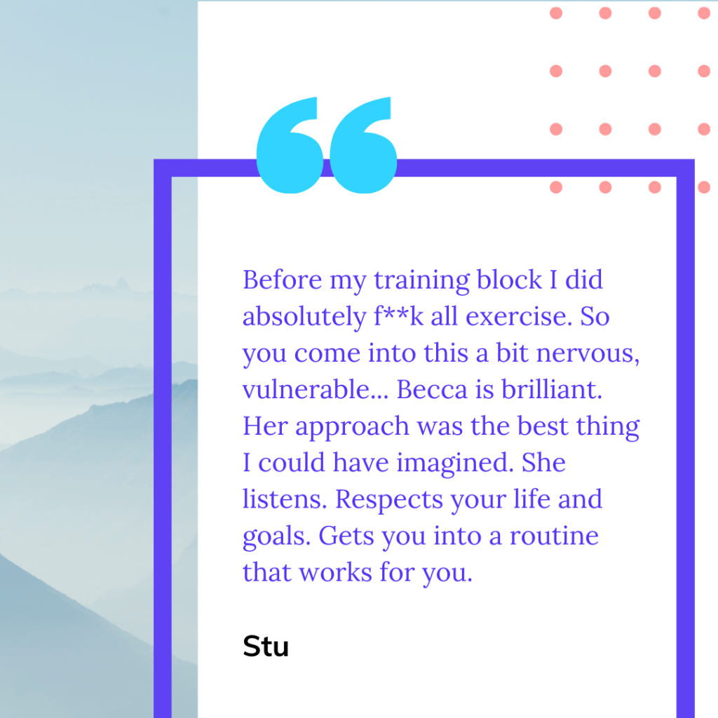 ‘Before my training block I did absolutely fuck all exercise. So you come into this a bit nervous, vulnerable… Becca is brilliant. Her approach was the best thing I could have imagined. She listens. Respects your life and goals. Gets you into a routine that works for you.’