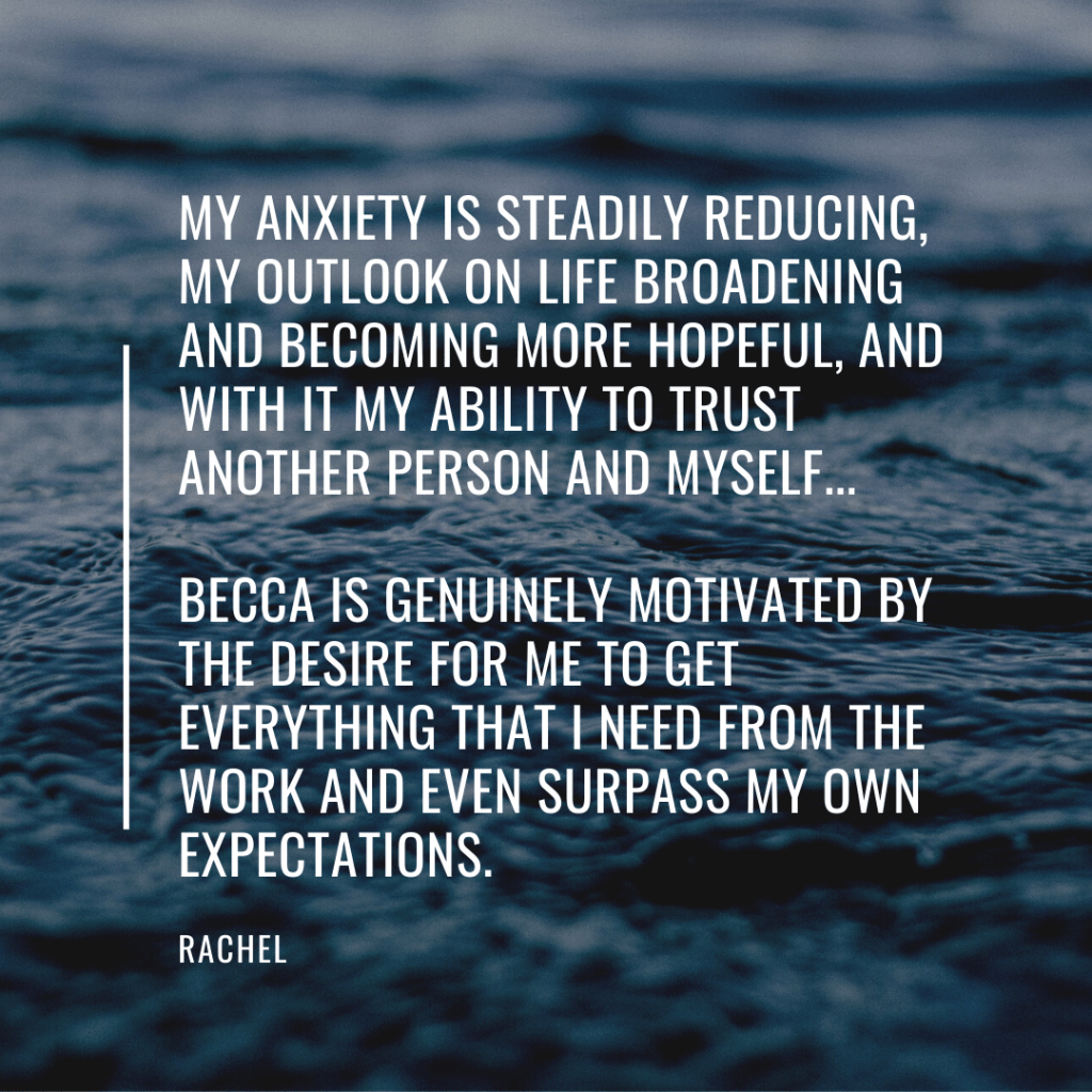 ‘Becca and I have formed a strong partnership during the last year which combines navigating complex trauma with learning how to strength train. I now feel stronger physically and emotionally, more confident and safer in my own skin. I have noticed improvements in my levels of positive self-image and self-esteem. My anxiety is steadily reducing, my outlook on life broadening and becoming more hopeful, and with it my ability to trust another person and myself.