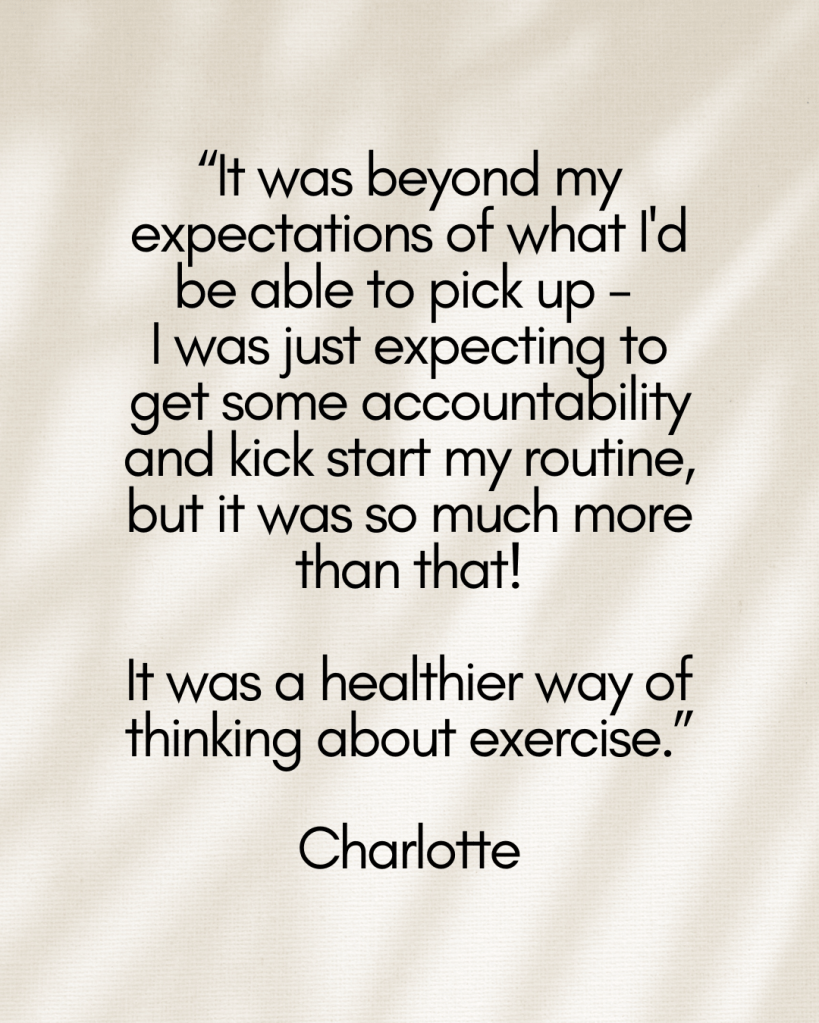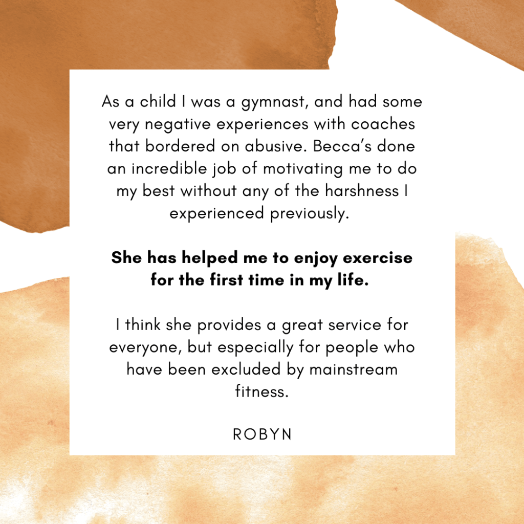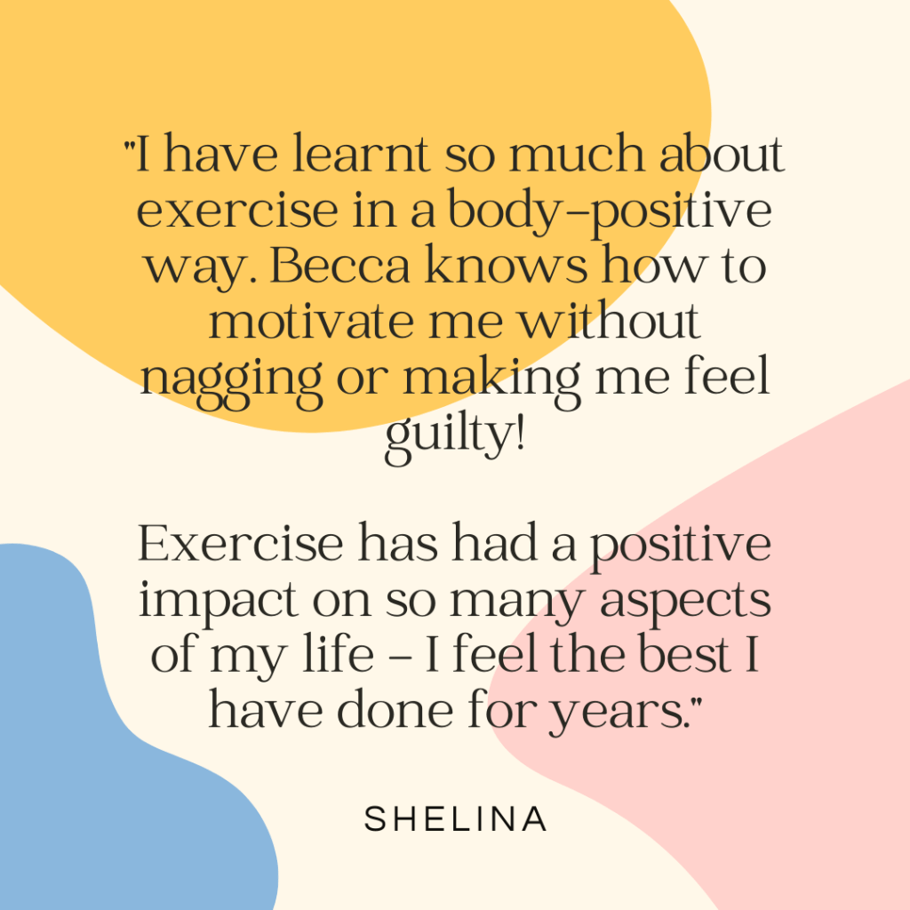 Becca is an amazing coach. I have learnt so much about exercise in a body-positive way. She works with my needs and my restrictions to get the best out of me. She knows how to motivate me without nagging or making me feel guilty!