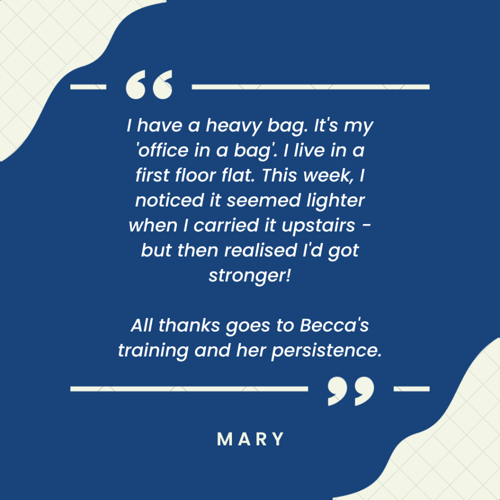 I absolutely love when clients report how their training is changing life outside the gym for them. That’s what it’s all about! Mary was very keen that I explain when sharing her feedback just how reluctant she has felt about the idea of working on her strength, to encourage others like her who aren’t naturally drawn to picking up weights.
